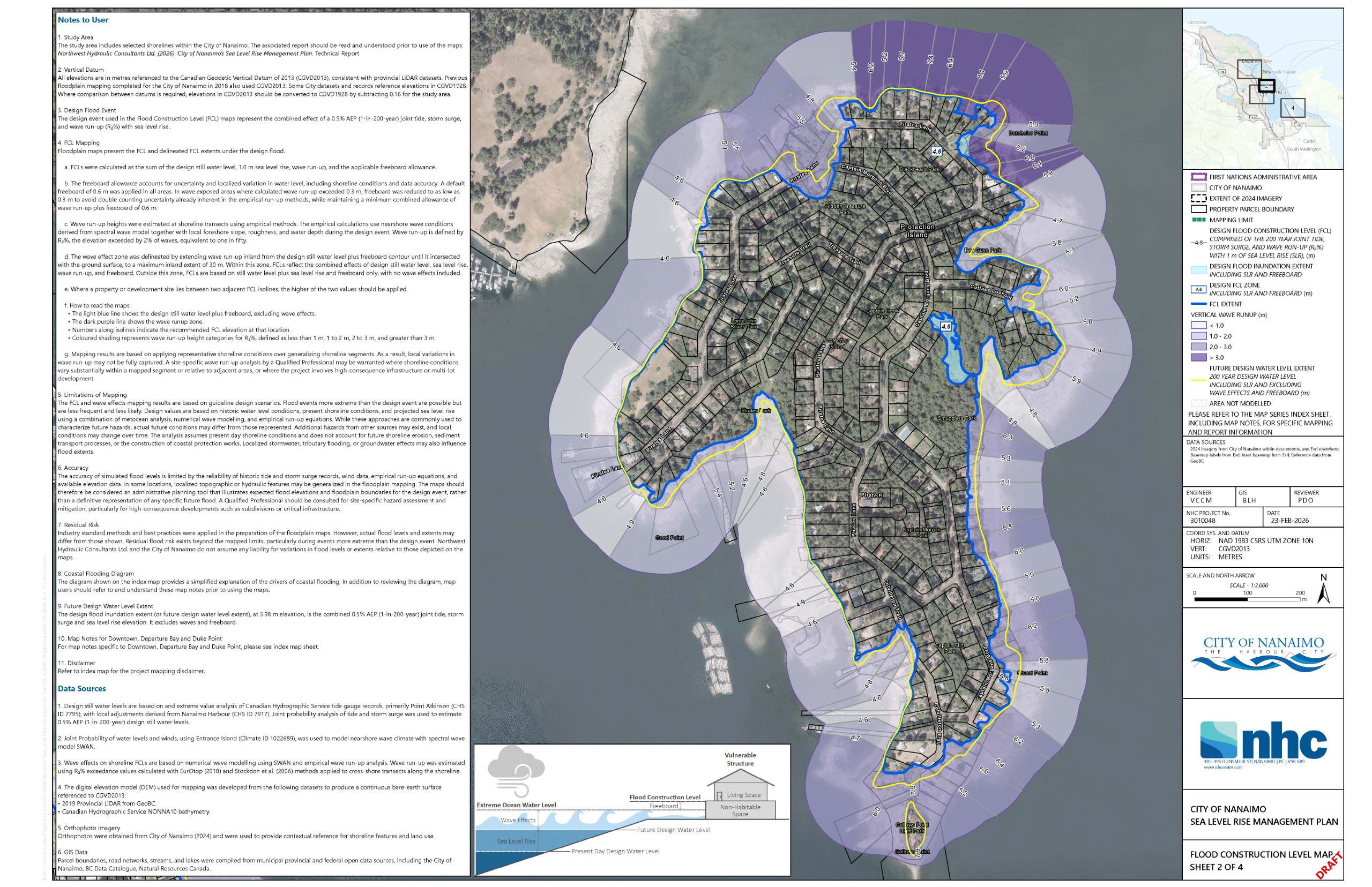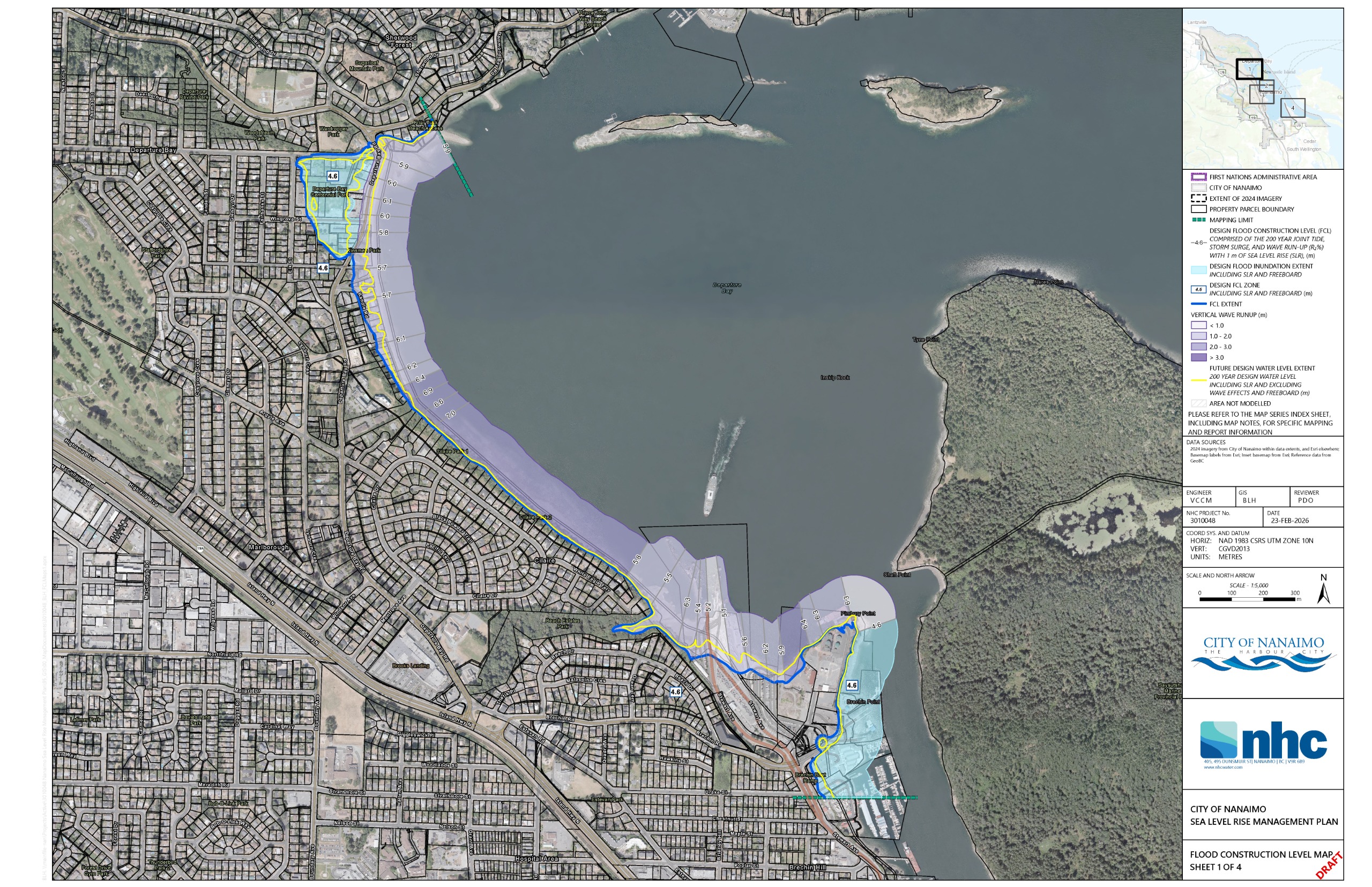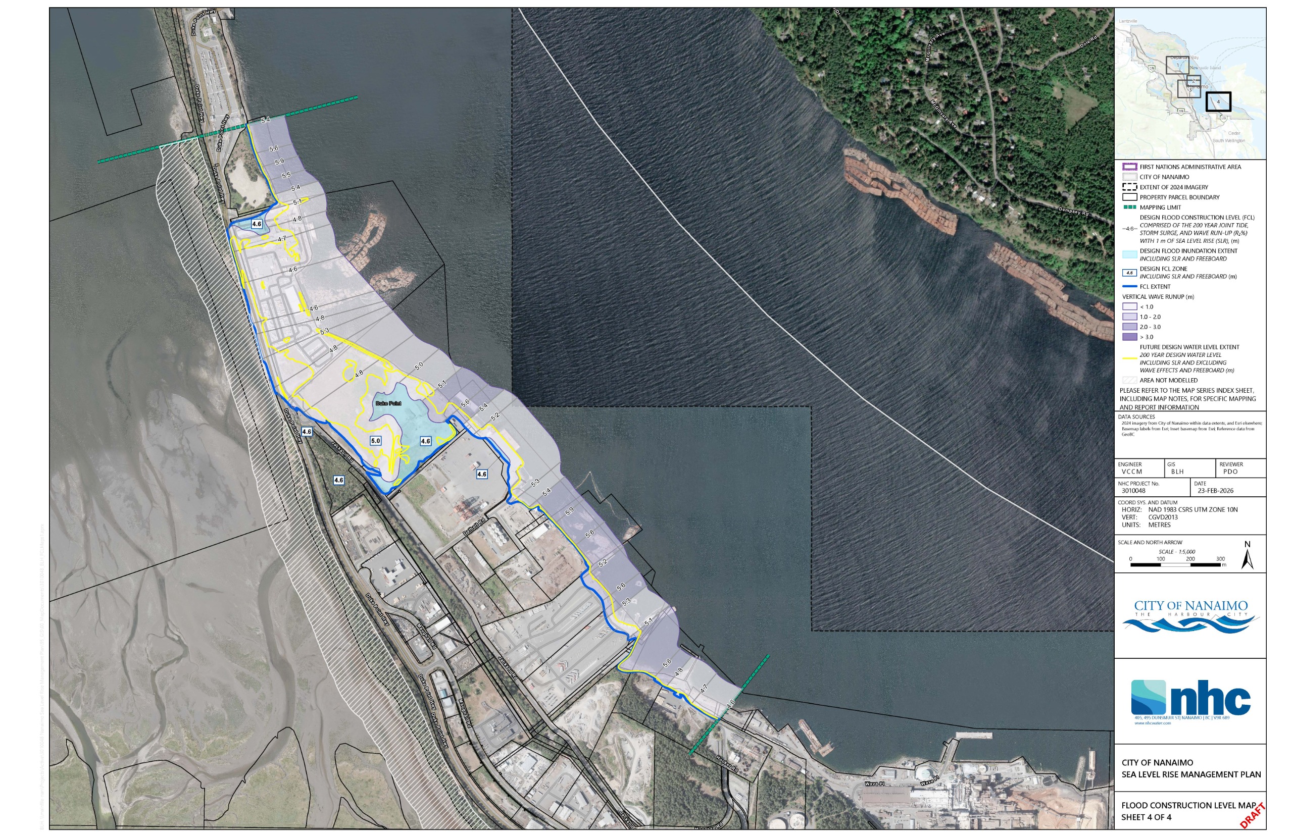 The Nanaimo Floodplain maps show the areas that could be flooded during a future large coastal event that has about a 1 in 200 chance of occurring in any given year. The maps are used to set flood construction levels, or FCLs. An FCL is the minimum elevation required for buildings and infrastructure so that living spaces are protected from flood damage.